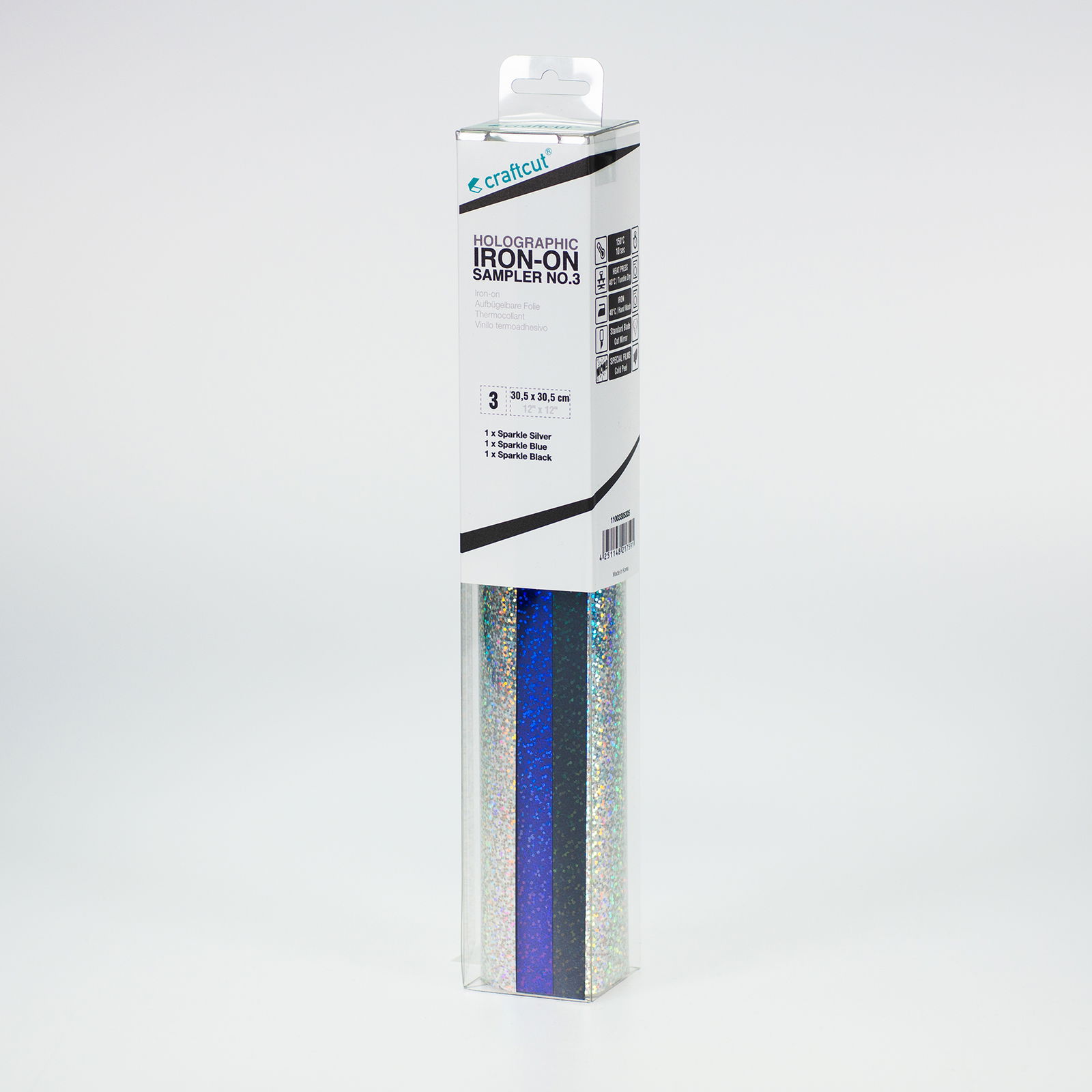 Verwandle deine Textilien in atemberaubende Kunstwerke mit der craftcut® Holographic Iron-On Bügelfolie, Sampler No.3. Dieses Set enthält drei hochwertige Folienstücke, jeweils in der Größe 30,5 cm x 30,5 cm, perfekt für eine Vielzahl von Projekten. Ob T-Shirts, Taschen, Kissen oder was dir sonst noch einfällt, die craftcut® Bügelfolie macht es möglich.